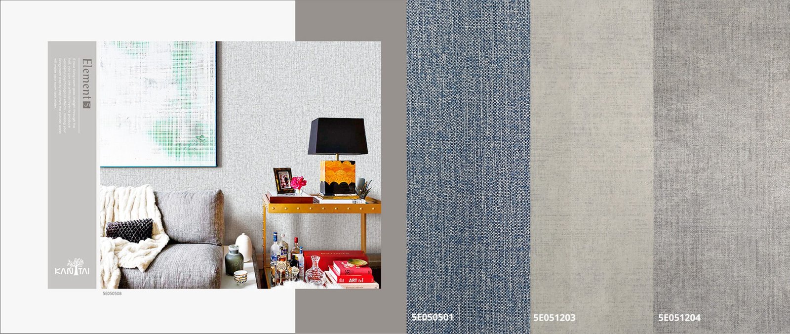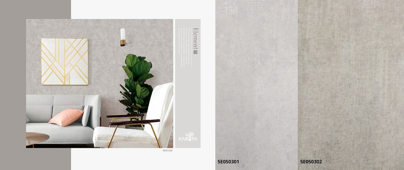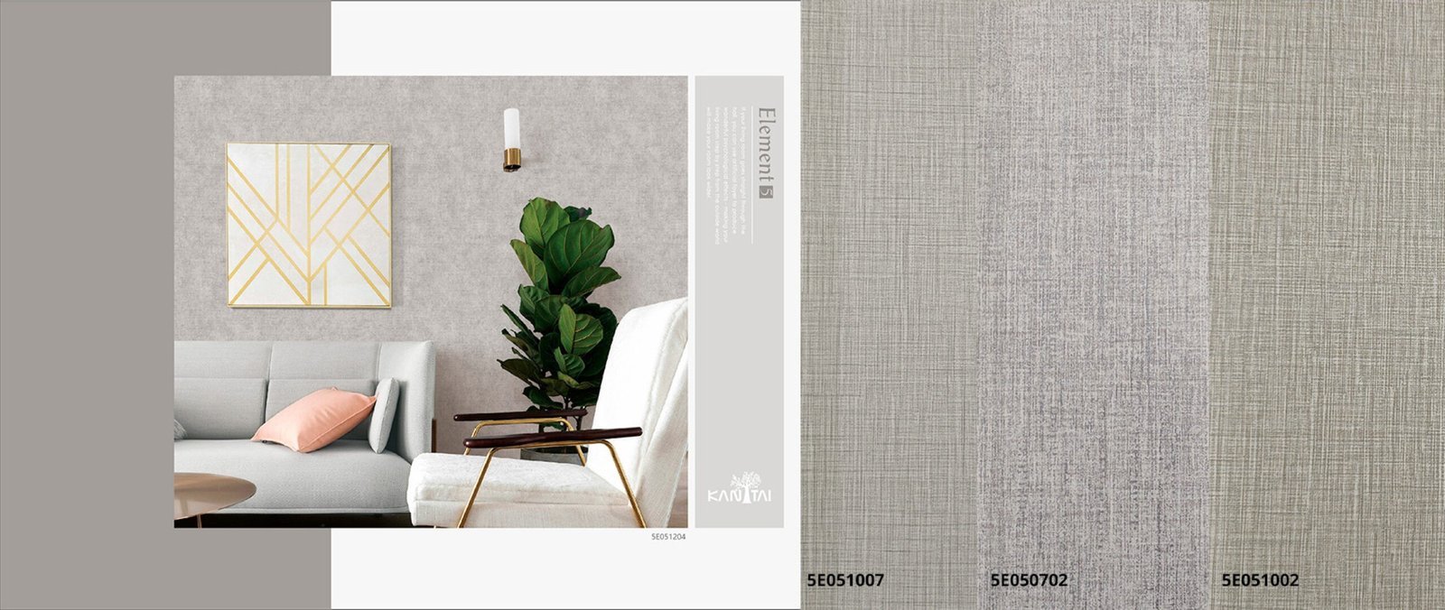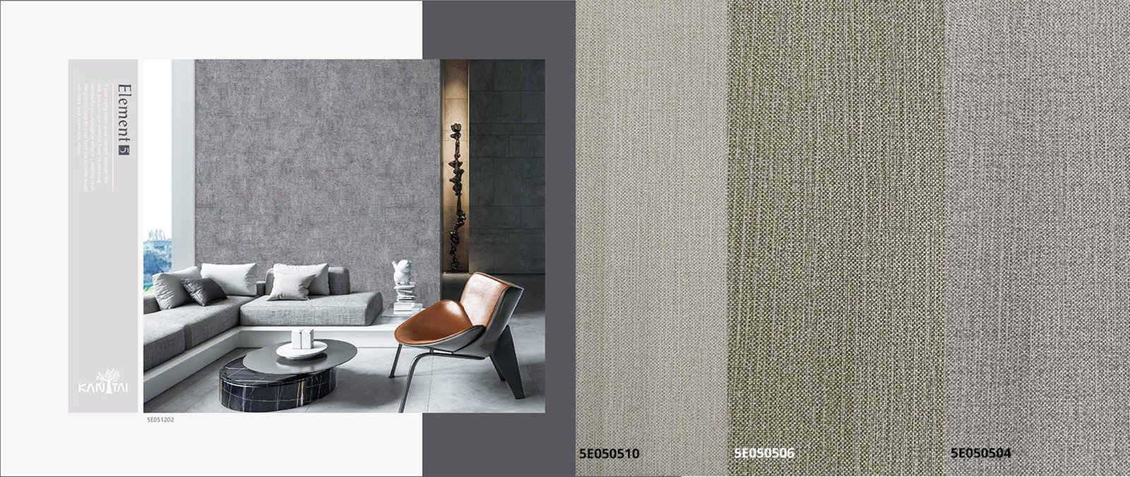 A linha Papel de Parede Element 5 Kan Tai, contém paleta de cores e texturas básicas, é possível brincar com texturas e profundidades. Funcionalidade é a palavra-chave que define essa coleção.