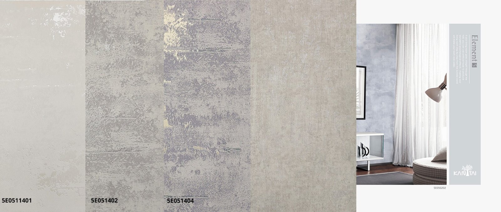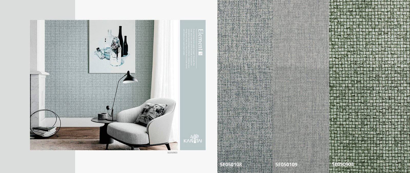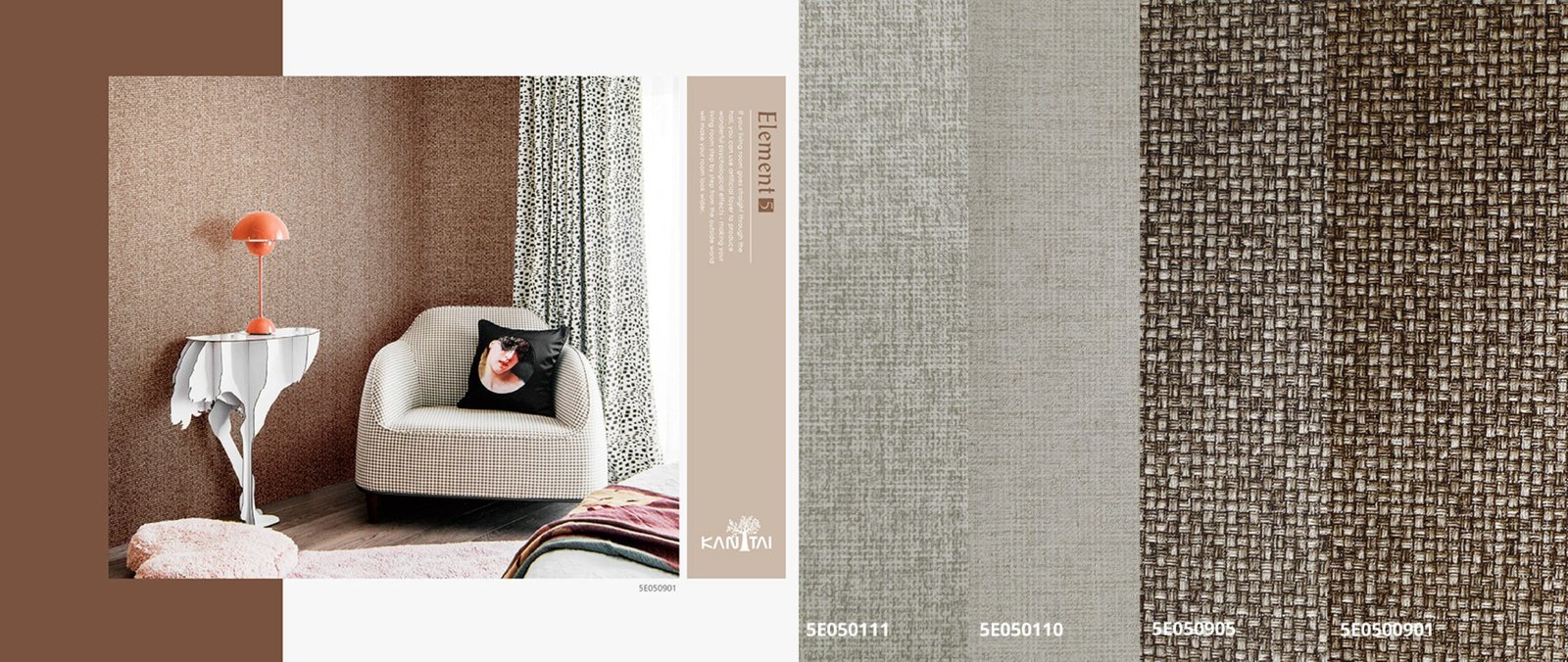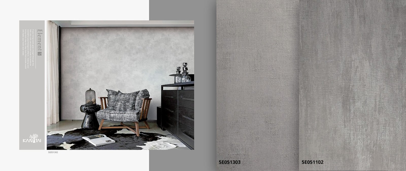 A linha Papel de Parede Element 5 Kan Tai, contém paleta de cores e texturas básicas, é possível brincar com texturas e profundidades. Funcionalidade é a palavra-chave que define essa coleção.